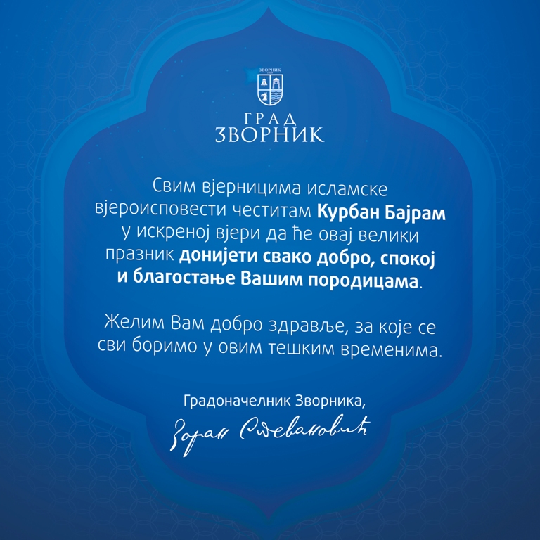 Povodom velikog praznika Kurban-bajrama gradonačelnik Zvornika Zoran Stevanović uputio je danas čestitku vjernicima islamske vjeroispovjesti sa željom da ga proslave u skladu sa tradicijom i u krugu svojih porodica.