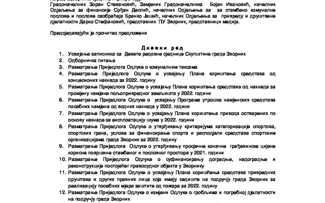 Извод из Записника са десете редовне сједнице Скупштине града Зворник