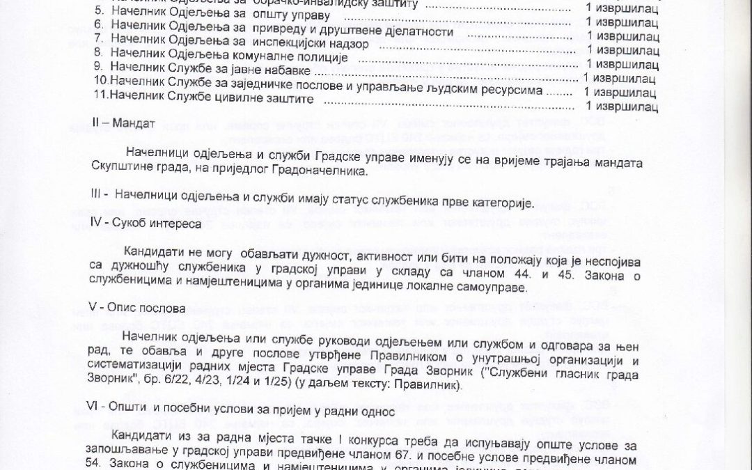 Јавни конкурс за избор и именовање начелника одјељења и служби у Градској управи града Зворник мар 19, 2025