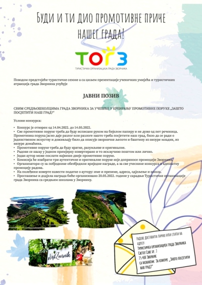 Povodom predstojeće turističke sezone, a sa ciljem prezentacije turističkih atrakcija našeg grada i učeničkih umijeća, TOGZ organizuje pomenuti konkurs.