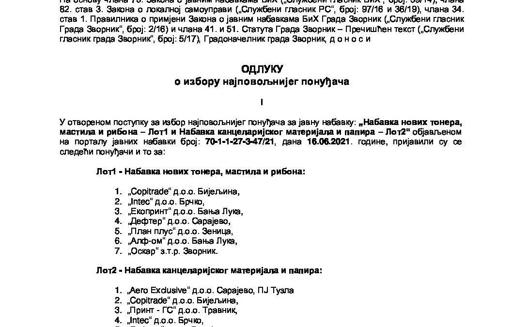 Набавка нових тонера, мастила и рибона – Лот1 и Набавка канцеларијског материјала и папира – Лот2 авг 13, 2021