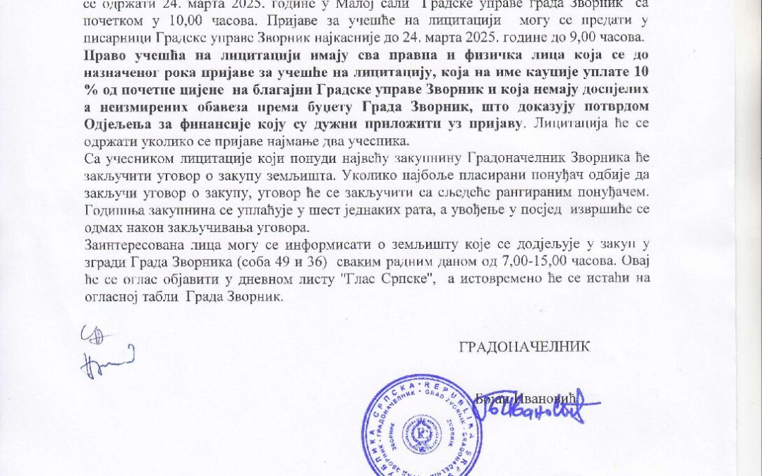 Поновни оглас о давању у закуп земљишта на пет (5) година