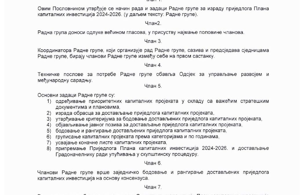 Пословник о раду Радне групе за израду приједлога Плана капиталних инвестиција 2024-2026.године Jan 12, 2024