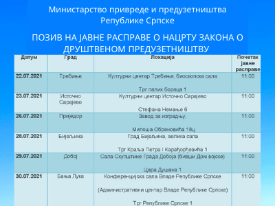 Министарство привреде и предузетништва Републике Српске позива све заинтересоване институције, организације и лица на јавне расправе о Нацрту закона о друштвеном предузетништву.