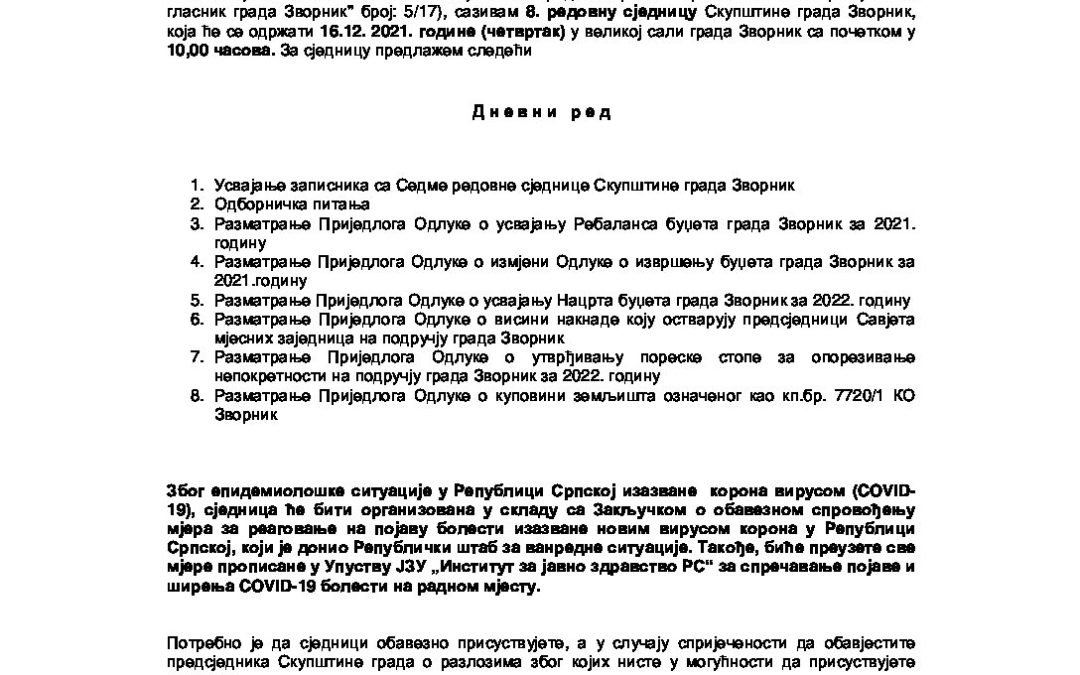 Позив за 8. редовну сједницу Скупштине града Зворник