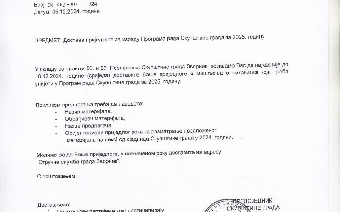 Позив за доставу приједлога за израду програма рада Скупштине града Зворника за 2025.годину Dec 5, 2024