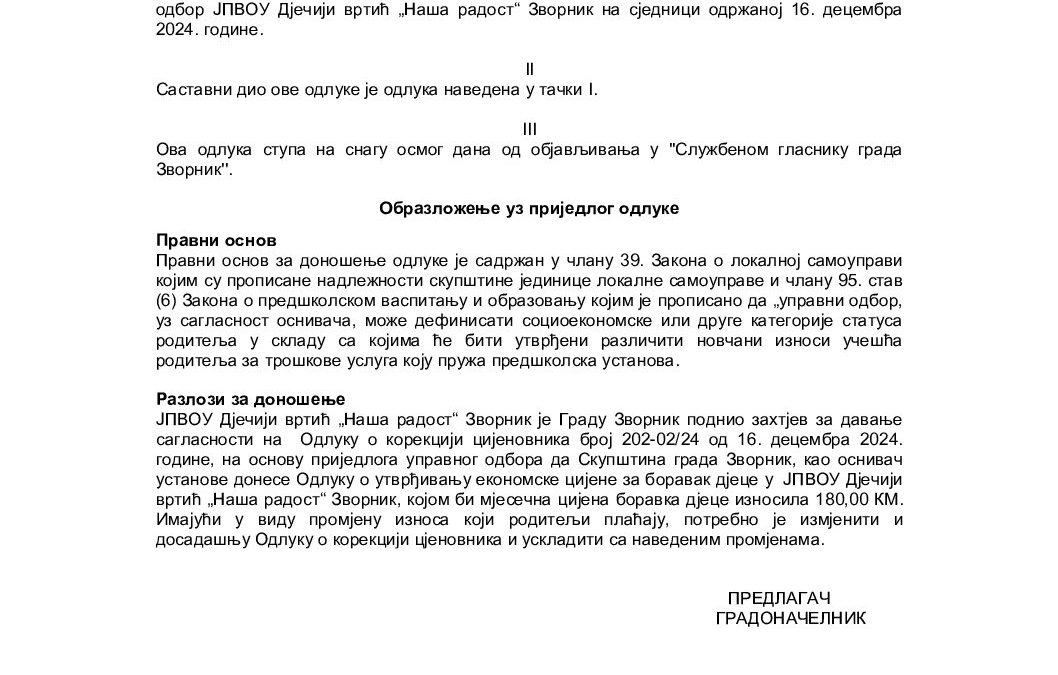 Приједлог Одлуке о давању сагласности на Одлуке о корекцији цјеновника