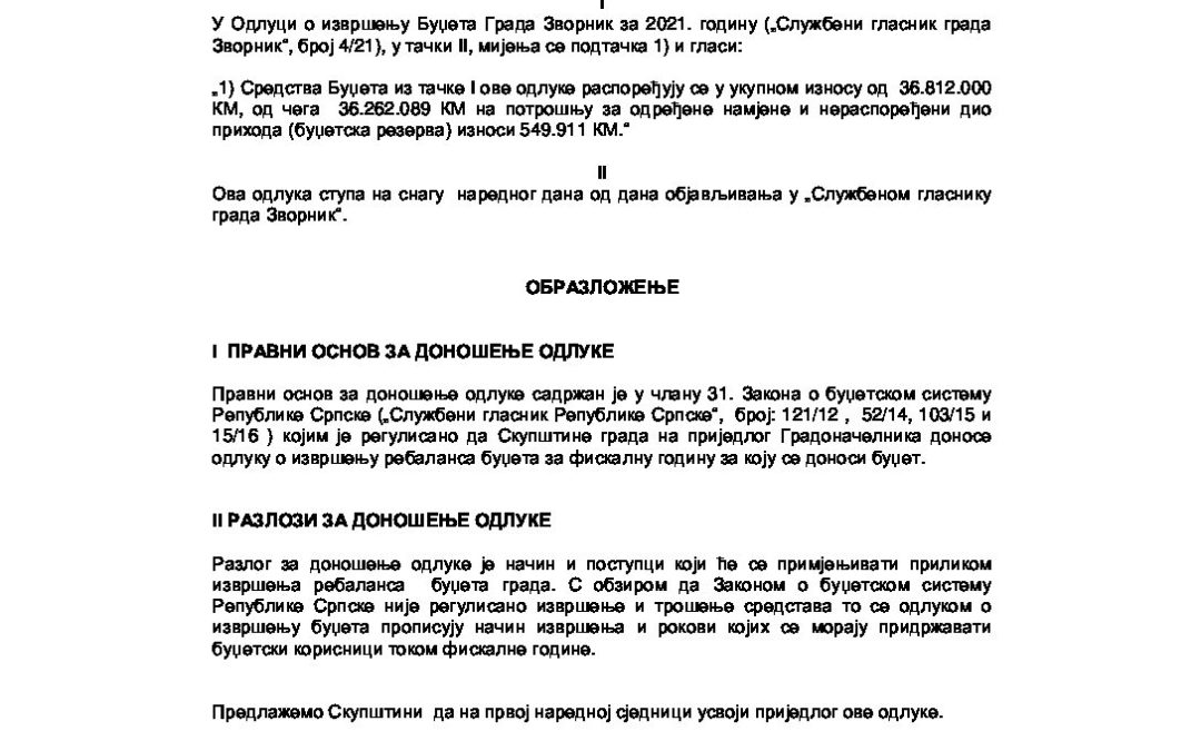 Приједлог Одлуке о измјени Одлуке о извршењу буџета града Зворник за 2021 годину