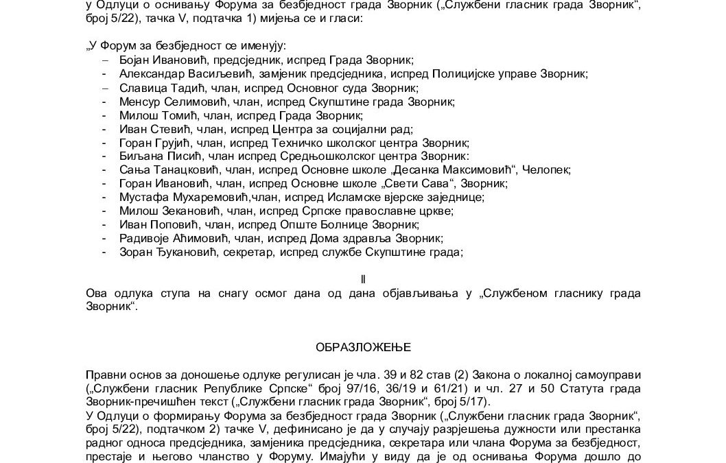 Приједлог Одлуке о измјени Одлуке о оснивању Форума за безбједност града