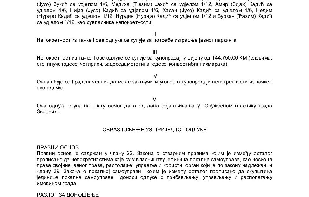 Приједлог Одлуке о куповини непокретности означене као к.п. број 271 КО Зворник-град, за потребе изградње јавног паркинга феб 21, 2024