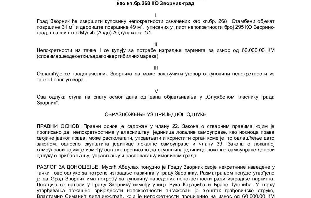 Приједлог Одлуке о куповини непокретности означених као кп.бр. 268 КО Зворник-град