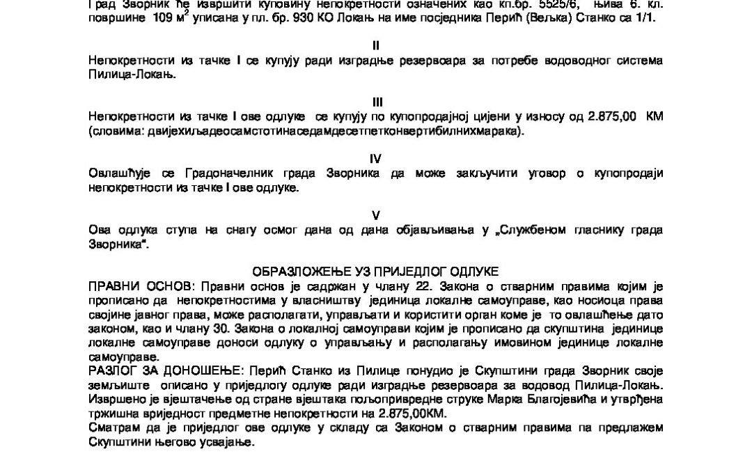 Приједлог Одлуке о куповини земљишта означеног као кп.бр. 5525-6 КО Локањ