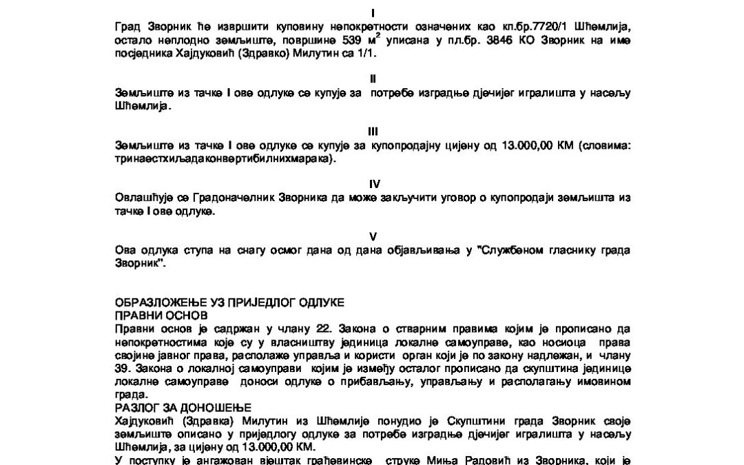 Приједлог Одлуке о куповини земљишта означеног као кп.бр. 7720-1 КО Зворник