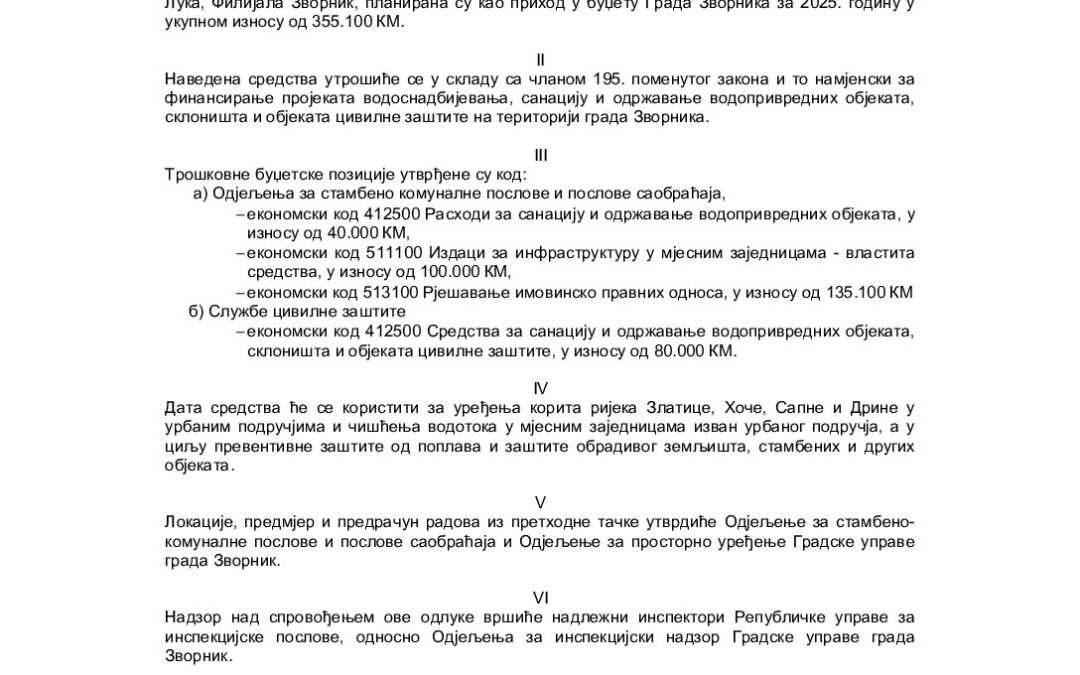 Приједлог Одлуке о намјенском кориштењу средстава од водних накнада у 2025. години