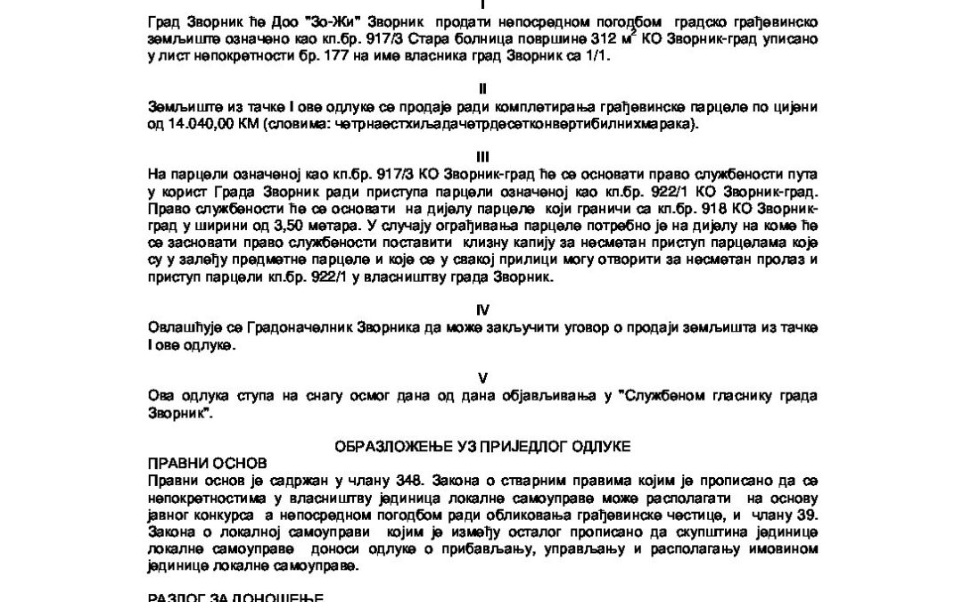 Приједлог Одлуке о продаји земљишта кп.бр. 917-3 КО Зворник – град непосредном погодбом ради комплетирања парцеле јул 9, 2021