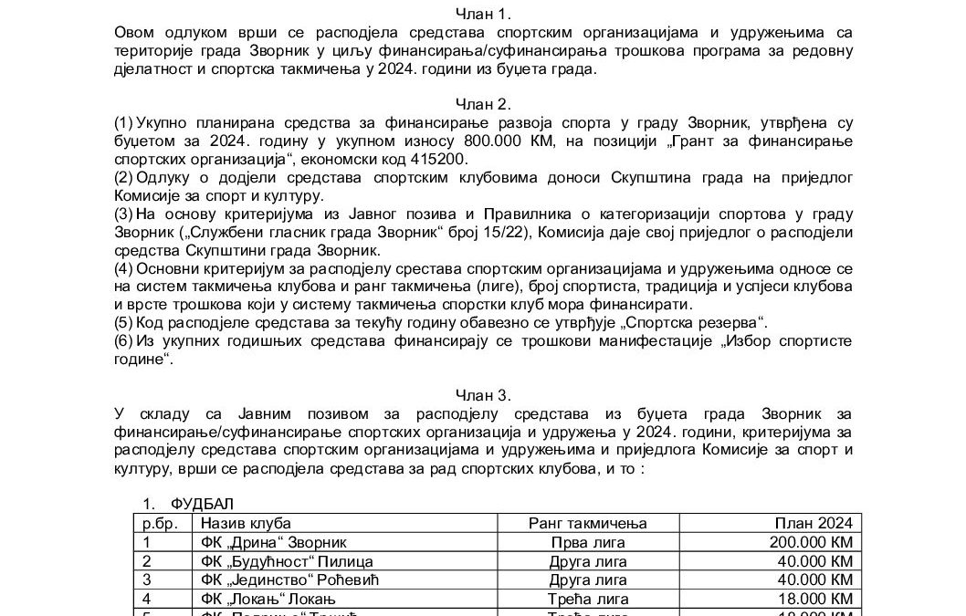 Приједлог Одлуке о расподјели средстава из буџета града Зворник за финансирање суфинансирање спортских организација. години Feb 21, 2024