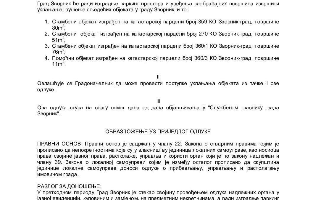 Приједлог Одлуке о уклањању објеката у граду Зворник ради изградње паркинг простора и уређења саобраћајних површина feb 21, 2024