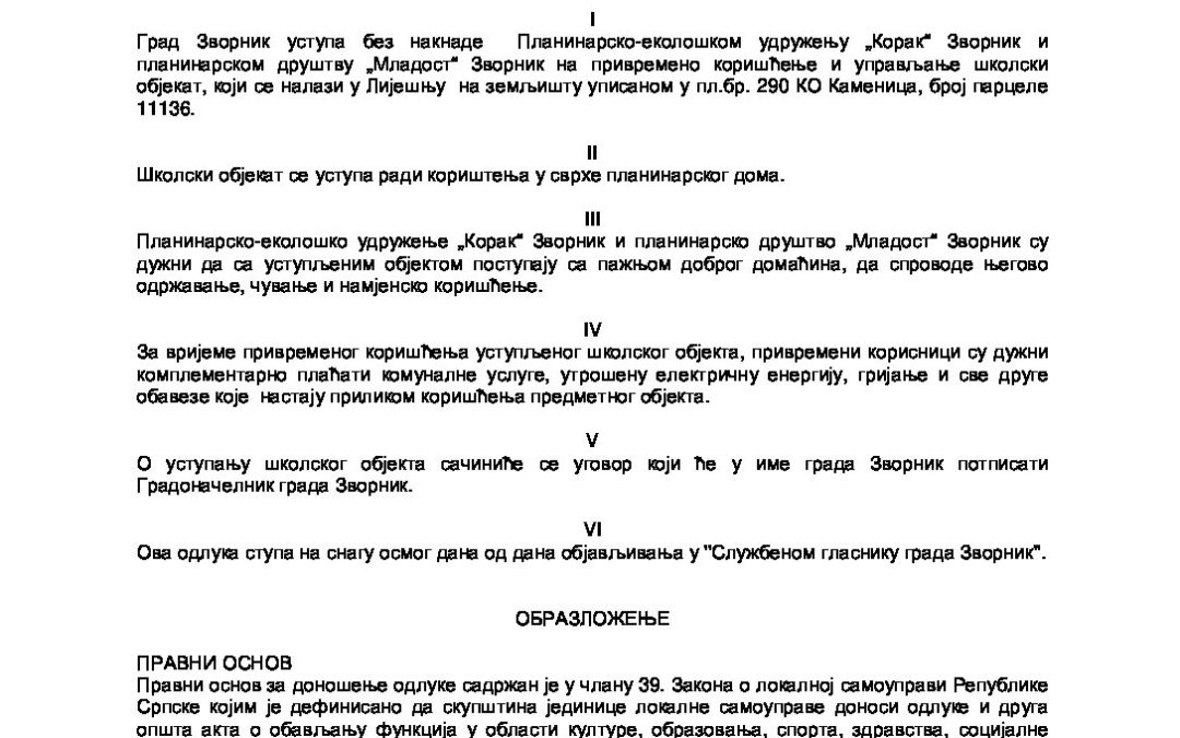 Приједлог Одлуке о уступању школског објекта на привремено коришћење и управљање Планинанрско – еколошком удружењу мај 20, 2021
