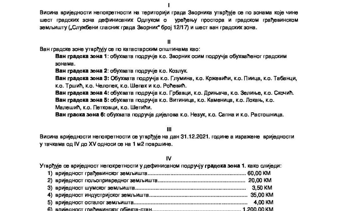 Приједлог Одлуке о висини вриједности непокретности по зонама на територији града Зворника на дан 31.12.2021. године дец 24, 2021