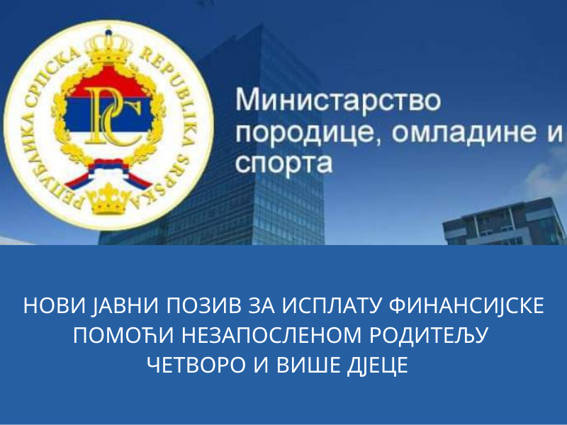 Министарство породице, омладине и спорта у Влади Републике Српске расписало је нови Јавни позив за исплату финансијске помоћи незапосленом родитељу четворо и више дјеце у Републици Српској који ће бити отворен до 31. децембра 2022. године.