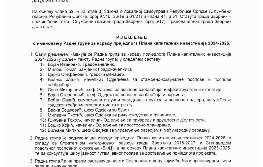 Рјешење о именовању Радне групе за израду приједлога Плана капиталних инвестиција 2024-2026. године јан 12, 2024