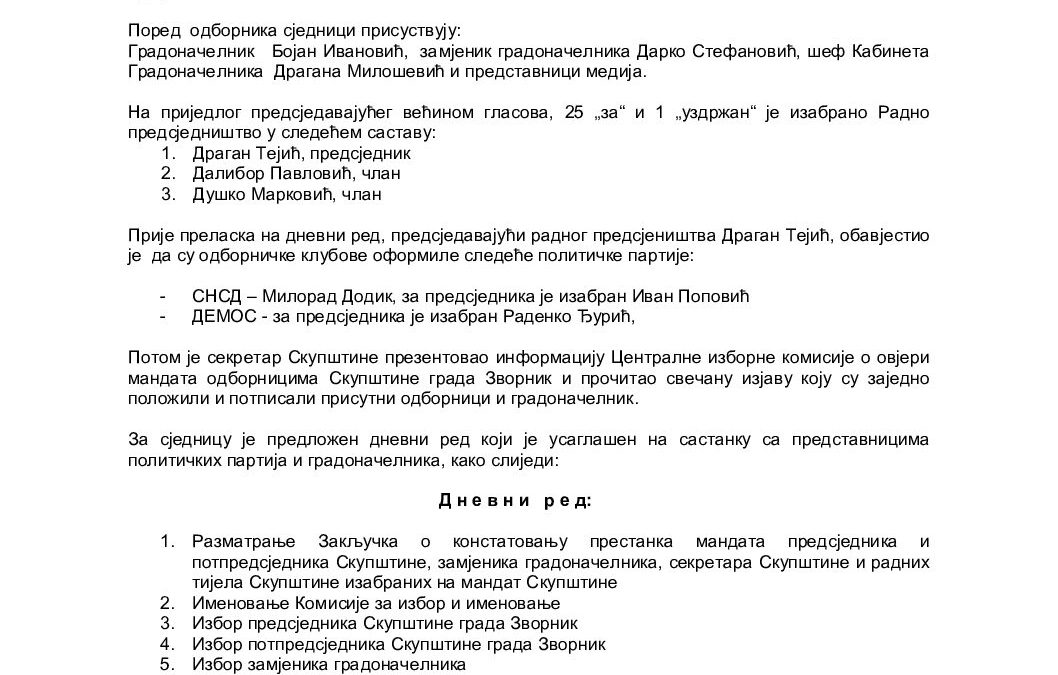 Записник са Конститутивне сједнице Скупштине града Зворник