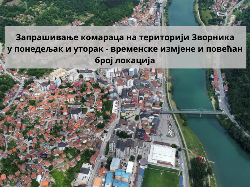 „Санитација“ Д.О.О. најавила је да ће запрашивање комараца на територији града Зворника у понедељак, 18. јула, и у уторак, 19. јула, почети у 19:00 умјесто раније најављених 19:30 часова и биће вршена до 23:30 часова.