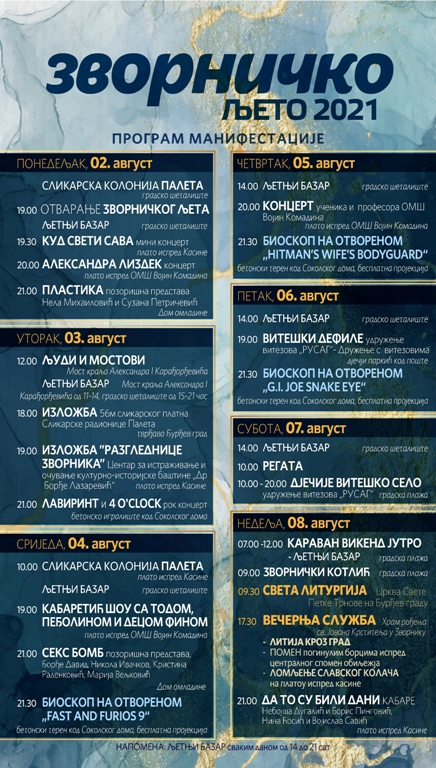 Zvorničko ljeto 2021 ima bogat program, ali usklađen sa aktuelnom epidemiološkom situacijom. Neki od događaju su „Ljudi i mostovi“, Drinska regata, Paletina slikarska kolonija, Ljetnji bazar, predstave, bioskop na otvorenom, izložbe, koncerti, Kabaretić i Viteško selo za najmlađe Zvorničane. Poslednjeg dana, po posebnom programu, biće obilježena i slava grada, dok će RTRS od 7:00 do 12:00 časova na gradskoj plaži uživo emitovati Vikend jutro.